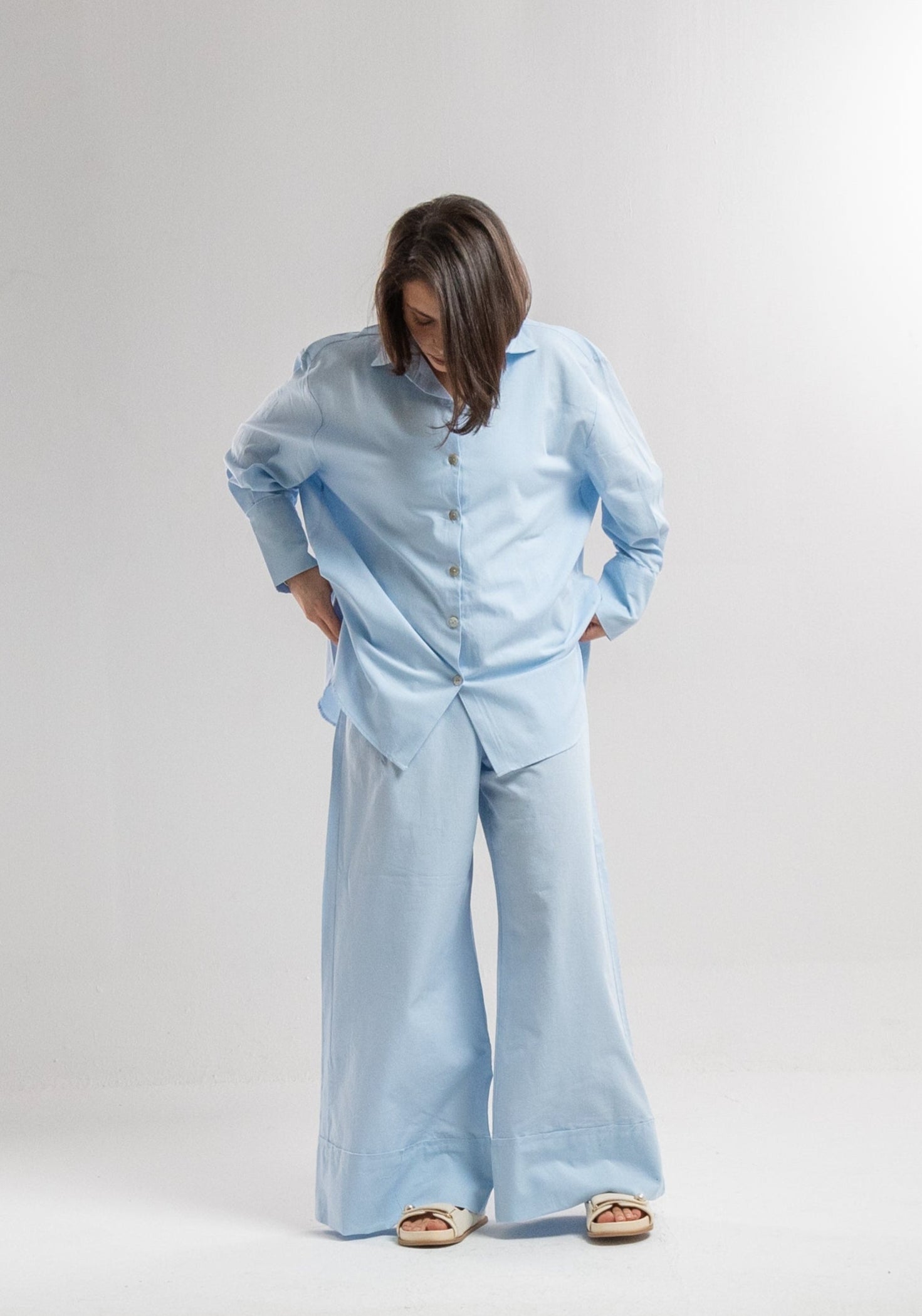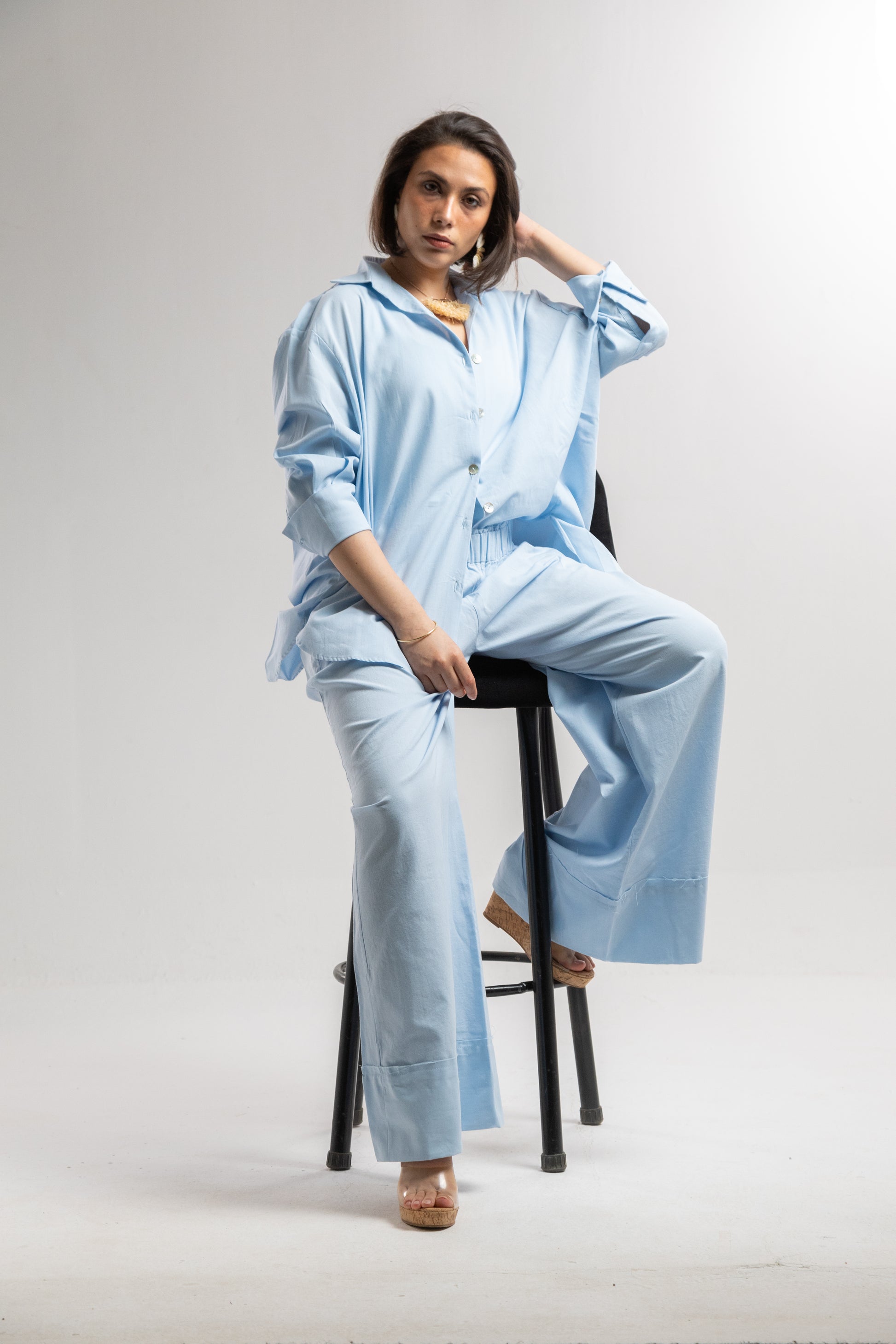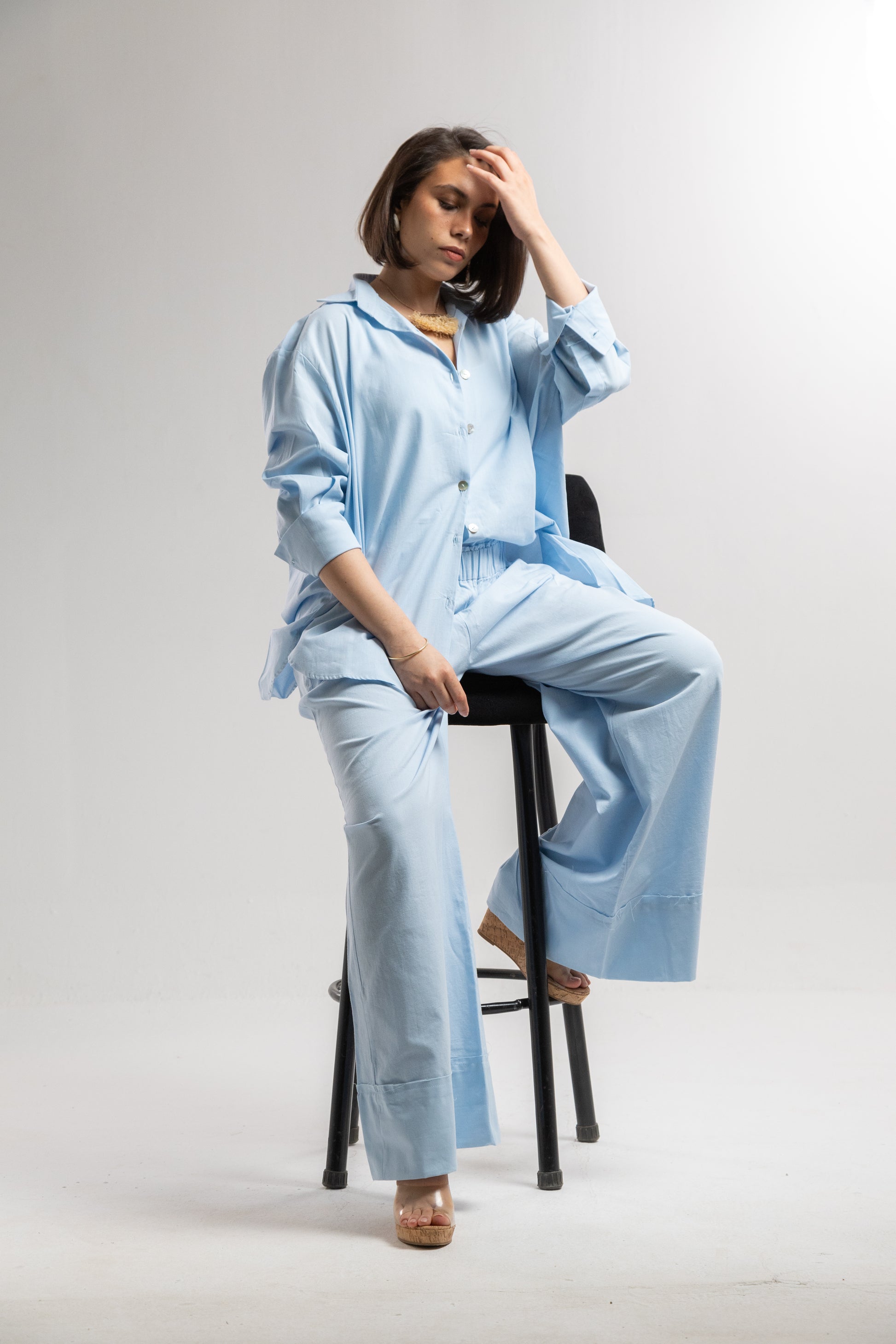 Crafted from 100% cotton with a special woven technique that gives it a linen-like texture, this set is both breathable and refined. The oversized shirt pairs effortlessly with wide-leg pants, creating a relaxed yet elevated silhouette. Presented in a soft baby blue, it adds a fresh and serene touch to your wardrobe.